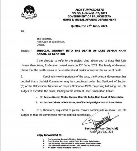 عثمان کاکڑ کی ہلاکت کا معاملہ ، حکومت بلوچستان نے جوڈیشل تحقیقات کا حکم دیدیا