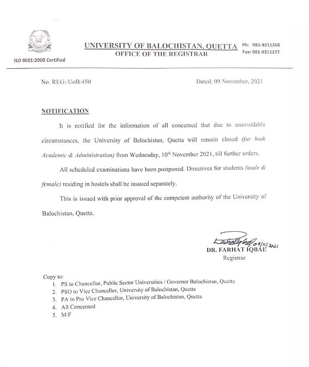 کوئٹہ (انتخاب نیوز)کوئٹہ بلوچستان یونیورسٹی سے ایک نوٹیفکیشن جاری ہوا جس میں اعلان کیا گیا ہے کہ کل بدھ کے روز سے بحکم ثانی تمام امتحانات ملتوی کر کے یونیورسٹی کو بند کر دیا گیا ہے، ہاسٹل میں رہائش پزیر تمام طلباء و طالبات کے حوالے سے علیحدہ احکامات جاری کئے جائینگے،