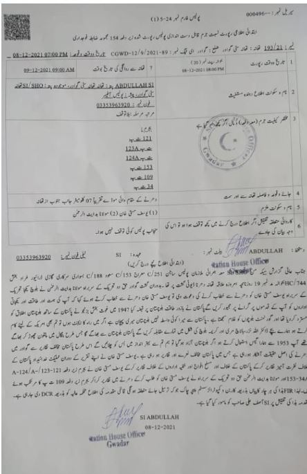گوادر(انتخاب نیوز)بلوچ قوم پرست رہنماء یوسف مستی خان کو غداری کے الزام میں گرفتار کر لیا گیا، اطلاعات کے مطابق وہ حق دو تحریک میں شرکت کیلئے گئے تھے، ایف آئی آر میں درج ہے کہ گوادر حق دو تحریک کے سربراہ ہدایت الرحمن بلوچ متحدہ محاذ کے سربراہ یوسف خان مستی کو دھرنے سے خطاب کرنیکی دعوت دی یوسف خان مستی نے خطاب کرتے ہوئے کہا کہ آپ کی ہمت اور طاقت اور یکجہتی سے اداروں کوآپ کے قدموں پر گرنے پر مجبور کرینگے گے پاکستان میں بزور طاقت بلوچستان پر قبضہ کیا، 1947 میں غوث بخش بزنجو نے پاکستان کیساتھ بلوچستان الحاق کو مسترد کر دیا تھا اور گورنمنٹ بلوچوں کو غلام سمجھتی ہے، پاکستان سے میرا کوئی واسطہ نہیں، بلوچستان میری پہچان ہے، اگر میں را کا ایجنٹ ہو تو تم بھی امریکہ کیلئے کام کرتے ہو، ہمارے بچے ڈاکٹر اللہ نذر، بالاچ مری، اور کریمہ کی شکل میں تمہارا مقابلہ کرینگے، پاکستان بلوچستان سے بھاگے گا،جس طرح بنگلہ دیش میں پتلون چھوڑ کر بھاگے تھے، آپ 1953سے ہمارا گیس استعمال کر رہے ہو،اگر بلوچستان آزاد ہوگیا تو تم سے بہتر انداز میں چلائیں گے، ایف آئی آر کے مطابق اس طرح کی پاکستان مخالف تقاریر سے گوادر میں دھرنے کی اصل حقیقت آشکار ہو رہی ہے، جس میں پاکستان مخالف نعرے اور تقاریر ہو رہی ہیں،ایف آئی آر کے مطابق یوسف مستی خان نے اپنی تقریری کے دوران مملکت خداداد پاکستان کے خلاف نفرت آمیز تقاریر کر کے پاکستان کیخلاف، مسلح افوج اور خفیہ اداروں کیخلاف بجرم زیر دفعہ 121-123/A/-A24 34A-153اور حق دوتحریک کے سربراہ مولانا ہدایت الرحمن نے یوسف مستی خان کودھرنے میں طلب کرکے دھرنے میں تقاریر کرا کر بجرم دفعہ 109ت پ کا مرتکب ہوئے ہیں۔