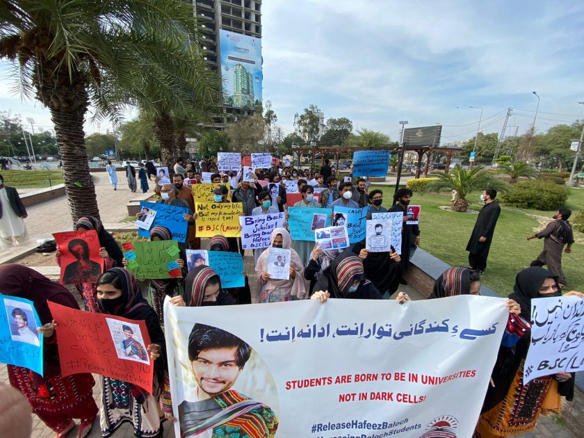 خواتین و دیگر مظاہرین نے مختلف پلے کارڈز اور چارٹس اٹھا رکھے تھے جن میں بلوچ طلباء کی جبری گمشدگی کے خلاف نعرے درج تھے اور حفیظ بلوچ کی بازیابی کا مطالبہ بھی شریک تھا۔ احتجاج لاہور میں لبرٹری چوک پر کیا گیا جہاں مقررین نے بات کرتے ہوئے حفیظ بلوچ کی باحفاظت بازیابی کا مطالبہ کیا اور جبری گمشدگی کے بڑھتے واقعات اور طلباء کی گمشدگی پر شدید تشویک کا اظہار کیا۔