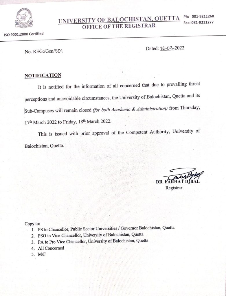 کوئٹہ،سیکورٹی خدشات کے باعث جامعہ بلوچستان دو دن کیلئے بند
