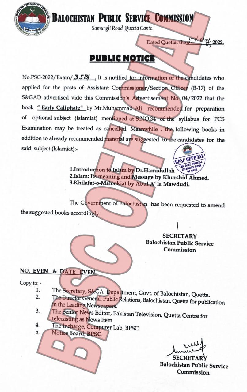 کوئٹہ (انتخاب نیوز)بلوچستان پبلک سروس کمیشن نے مقابلے کے امتحانات میں ا سلامیات کے مضمون کی تیاری کیلئے محمد علی قادیانی کی کتاب کو نصاب سے خارج کر دیا،جبکہ محمد علی قادیانی کی کتاب Early Caliphate کی جگہ نصاب میں مزید تین کتابوں کو شامل کیا گیا جس میں اسلامیات (Sr.No 40)کے مضمون کی تیاری کی جائیگی، مجوزہ کتاب میں