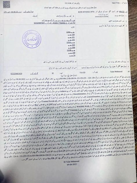اسلام آباد (انتخاب نیوز) شہباز گل کے خلاف درج مقدمہ کی ایف آئی آر سامنے آگئی۔ مقدمے میں سنگین نوعیت کی دفعات شامل ہیں۔ اسلام آباد پولیس کی جانب سے پی ٹی آئی رہنما شہباز گل کےخلاف تھانہ کوہسار میں مقدمہ درج کرلیا گیا۔ مقدمے میں بغاوت ،اداروں کےخلاف اکسانے کی دفعات شامل، مقدمہ ضلعی انتظامیہ کی مدعیت میں درج کیا گیا۔ مقدمے میں دفعہ 505،120،124 اے اور 196 شامل۔ مقدمے میں شہباز گل پر فوج کے خلاف اکسانے کا الزام عائد گیا گیا۔ ایف آئی آر میں نجی ٹی وی چینل پر کی گئی گفتگو کا بھی ذکر کیا گیا۔ ملزم نے بیان سوچ سمجھ کر ملکی سا لمیت کو نقصان پہنچانے کیلئے دیا، ایف آئی آر کا متن۔ ملزم ایسا بیان دے کر ملک دشمن ایجنڈے کی تکمیل اور مجرمانہ سازش کا مرتکب ہوا، متن۔