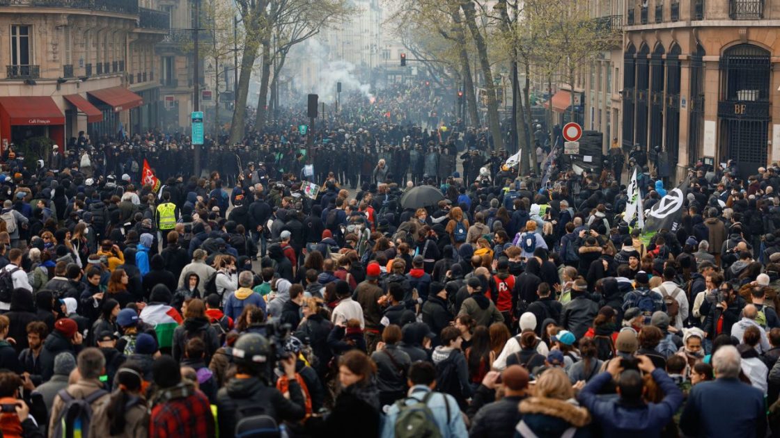 پیرس(مانیٹرنگ ڈیسک)فرانس میں ریٹائرمنٹ ایج بڑھانے کا صدرمیکراں کا متنازع بل عدالت سے بھی پاس ہوگیا۔ملک بھرمیں جاری مظاہروں میں تیزی آگئی ۔جلاؤ گھیراؤ،ہنگاموں کے دوران کئی افراد زخمی ہوئے،سیکڑوں کوگرفتارکرلیاگیا۔فرانس میں ریٹائرہونے کی عمر64 سال ہوگئی۔پنشن کی ادائیگی بھی دو سال کی تاخیر سے ہوگی۔صدر ایمانول میکراں کے پنشن ریفارمز بل کو آئینی کونسل نے گرین سگنل دیا تو عوام آگ بگولہ ہوگئے۔ مشتعل مظاہرین نے رین Rennes شہر میں پولیس اسٹیشن کو آگ لگادی۔آنسو گیس کی شیلنگ سے کئی مظاہرین کی حالت خراب ہے۔ پیرس سٹی ہال کے سامنے جمع مظاہرین کا کہنا ہے کہ جب تک ریفارمز واپس نہیں لی جاتیں،ہڑتالیں اورمظاہرے ختم نہیں ہوں گے۔پولیس نے 112افراد کو حراست میں لے لیا۔ پولیس اورمظاہرین کے درمیان جھڑپوں میں کئی افراد زخمی بھی ہوئے۔دوسری جانب یونین لیڈرزکا کہنا ہے کہ دوسری جنگ عظیم کے خاتمے کے بعد پہلی بار یونینوں نے مشترکہ طورپرتمام ملازمین سے یکم مئی کو بڑے پیمانے پرمظاہرے کی اپیل کی ہے۔