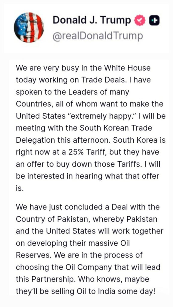 ویب ڈیسک : امریکی صدر ڈونلڈ ٹرمپ نے پاکستان کے ساتھ تجارتی معاہدے کرنے کا اعلان کرتے ہوئے ایک مرتبہ پھر بھارت کو طنز کا نشانہ بنا ڈالا۔امریکی صدر ڈونلڈ ٹرمپ نے اپنے ’ٹروتھ سوشل‘ پر پوسٹ کرتے ہوئے بتایا کہ ’ہم آج وائٹ ہاؤس میں تجارتی معاہدوں پر کام کرتے ہوئے بےحد مصروف ہیں، میں نے کئی ممالک کے رہنماؤں سے بات کی ہے جن میں سے ہر کوئی چاہتا ہے کہ امریکا انتہائی خوش ہو‘۔انہوں نے کہا کہ ’آج سہ پہر میری جنوبی کوریا کے تجارتی وفد سے ملاقات ہوگی، اس وقت جنوبی کوریا پر 25 فیصد محصولات لاگو ہے، لیکن اُن کے پاس ان ٹیرف کو کم کرنے کی پیشکش ہے، مجھے یہ سننے میں دلچسپی ہے کہ وہ پیشکش کیا ہے‘۔صدر ٹرمپ نے بتایا کہ ’ہم نے ابھی پاکستان کے ساتھ ایک معاہدہ طے کیا ہے، جس کے تحت پاکستان اور امریکا مل کر پاکستان میں تیل کے وسیع ذخائر کو ترقی دیں گے، ہم اس وقت اُس آئل کمپنی کا انتخاب کرنے کے عمل میں ہیں جو اس شراکت داری کی قیادت کرے گی‘۔صدر ٹرمپ اس موقع پر بھی بھارت کو نہیں بھولے، انہوں نے کہا کہ ’کون جانتا ہے، شاید وہ (پاکستانی) ایک دن بھارت کو تیل فروخت کر رہے ہوں‘۔انہوں نے مزید کہا کہ ’اسی طرح دیگر ممالک بھی ٹیرف میں کمی کے لیے پیشکشیں دے رہے ہیں، یہ تمام اقدامات ہمارے تجارتی خسارے کو بڑی حد تک کم کرنے میں مدد دیں گے‘۔انہوں نے کہا کہ اس حوالے سے ایک مکمل رپورٹ مناسب وقت پر جاری کی جائے گی۔
