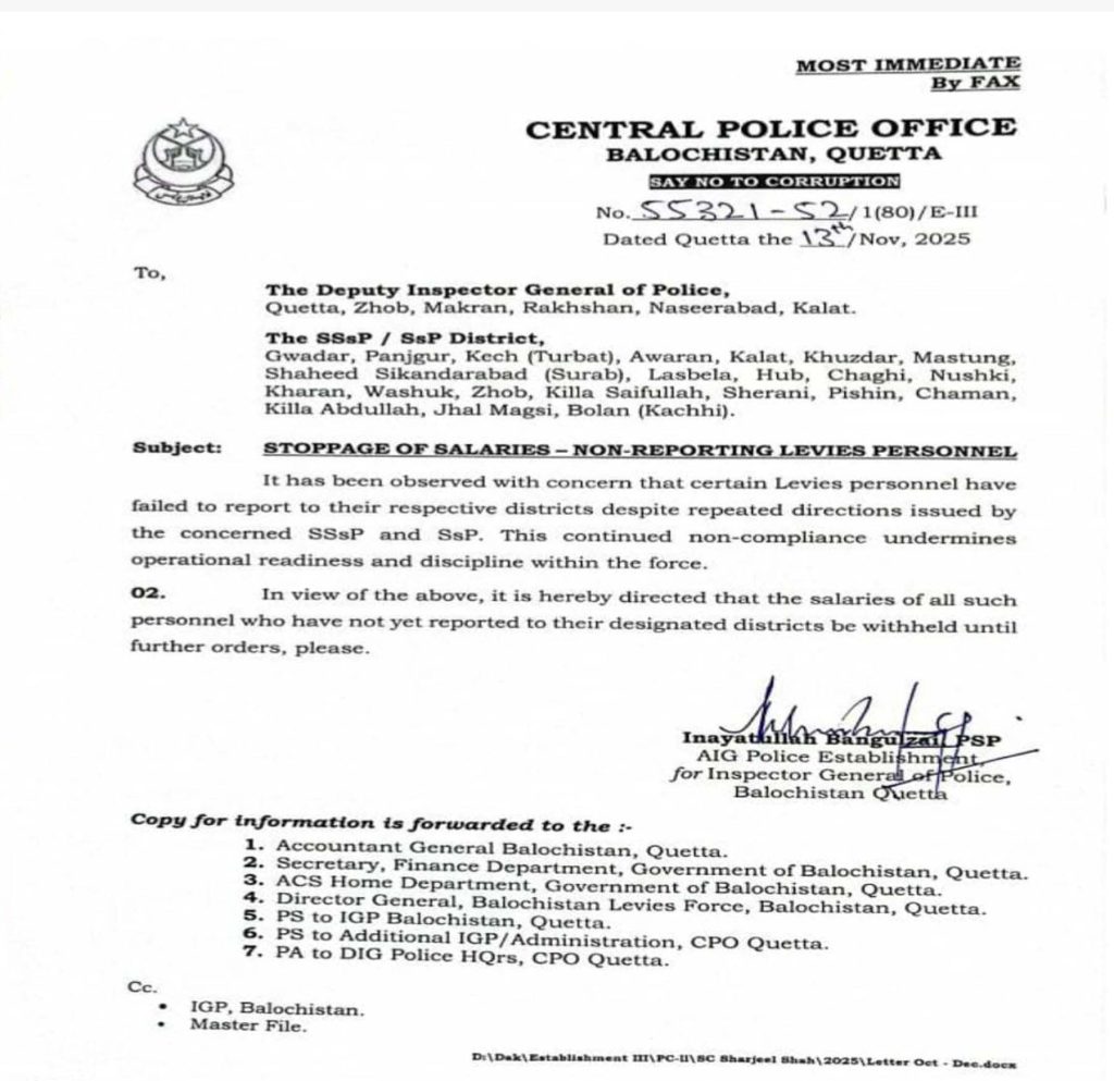 بلوچستان پولیس میں انضمام کے بعد غیر حاضر لیویز اہلکاروں کی تنخواہیں بند کرنے کا حکم