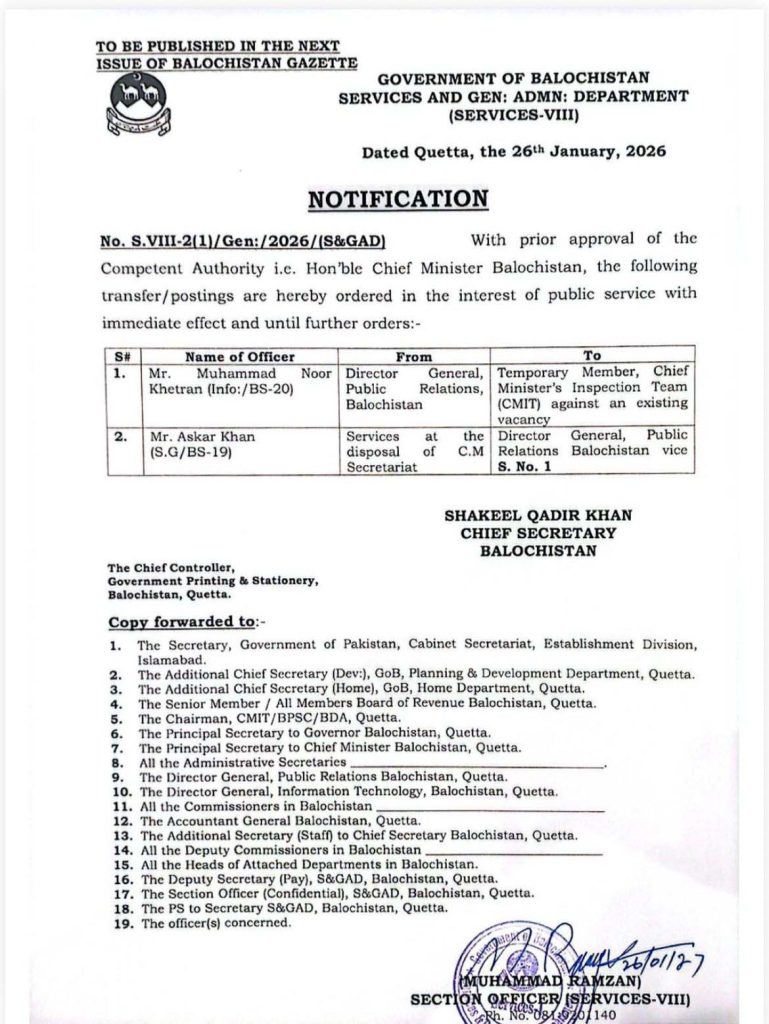 عسکر خان کو محکمہ تعلقات عامہ بلوچستان کا ڈائریکٹر جنرل تعینات کردیا گیا