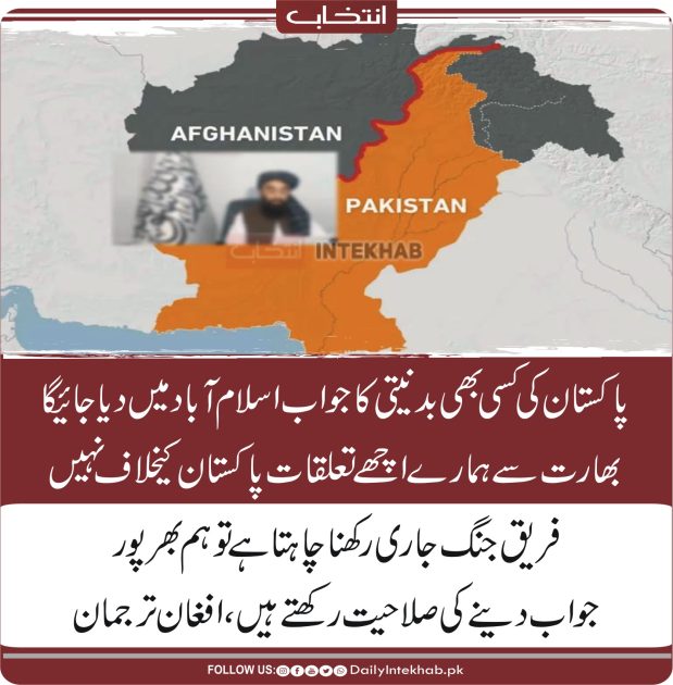 پاکستان کی کسی بھی بدنیتی کا جواب اسلام آباد میں دیا جائیگا، بھارت سے ہمارے اچھے تعلقات پاکستان کیخلاف نہیں، فریق جنگ جاری رکھنا چاہتا ہے تو ہم بھرپور جواب دینے کی صلاحیت رکھتے ہیں، افغان ترجمان