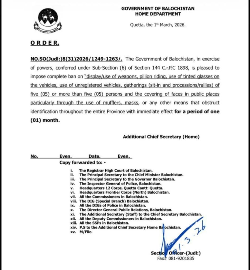 کوئٹہ (اسٹاف رپورٹر) حکومت بلوچستان نے صوبے بھر میں ایک ماہ کے لیے دفعہ 144 نافذ کر دی، محکمہ داخلہ بلوچستان کی جانب سے جاری نوٹیفکیشن کے مطابق اسلحہ کی نمائش و استعمال، موٹر سائیکل پر ڈبل سواری، کالے شیشوں والی گاڑیوں، غیر رجسٹرڈ گاڑیوں کے استعمال اور پانچ یا اس سے زائد افراد کے اجتماعات پر مکمل پابندی عائد کر دی گئی ہے۔ اس کے علاوہ عوامی مقامات پر چہرہ ڈھانپنے، ماسک، مفلر یا کسی بھی ایسے ذریعے کے استعمال پر بھی پابندی ہوگی جس سے شناخت میں رکاوٹ پیدا ہو۔ محکمہ داخلہ کے مطابق دفعہ 144 کا اطلاق یکم مارچ 2026 سے ایک ماہ کے لیے پورے صوبے میں ہوگا۔