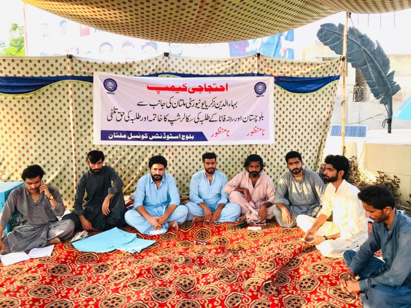 بلوچ سٹوڈنٹس کونسل ملتان کا بلوچستان اور سابقہ فاٹا کے طالب علموں کا فیس پالیسی لگاؤ کےخلاف احتجاجی کیمپ کا نواں دن ہے جو بہاؤالدین زکریا یونیورسٹی ملتان کےآگے لگایا گیا ہے جس میں طلبا نے میڈیا سے گفتگو کرتے ہوئے کہا کہ تاحال گورنمنٹ اور یونیورسٹی کی جانب سے ہماری کوئی بات نہیں سن پارہا ،ہم یہاں نو دن ہوئے بیٹھے ہوئے ہیں مگر مجال ہے کوئی ہماری بات سنے انہوں نے حکومت سے مطالبہ کرتے ہوئے کہا کہ وہ ہمارے اس مسئلے کوحل کرنے میں ہماری مددکریں اور اس نئی پالیسی کو واپس لیںانہوں نے گورنرپنجاب چوہدری سرور سےاپیل کرتے ہوئے کہا وہ بحثیتِ چانسلر بی زیڈیو ملتان فیس وصولی کےحکمنامہ کو واپس لیں اور یونیورسٹی انتظامیہ کوپرانی پالیسی پر پابند رکھیں واضح رہے احتجاجی کیمپ کی بجلی کی کنکشن کاٹ دی گئی ہے جس کی بلوچ سٹوڈنٹس کونسل ملتان کےچئیرمین وقاربلوچ نے مذمت کرتے ہوئے کہا کہ اب یونیورسٹی اوچھے ہتھکنڈوں پراترآئی ہے وہ ہرصورت ہمارے کیمپ کو اکھاڑنا چاہتے ہیں مگرایسے اوچھے ہتھکنڈوں سے ہمیں کوئی دبا نہیں سکتا ہمارا احتجاج مطالبات کے منوانے تک جاری رہے گا ،ہم ہرگز پیچھے نہیں ہٹیں گے ہم احتجاج کرتے رہیں گے ایسے اوچھے ہتھکنڈوں سے ہماری عزم کوآپ پست نہیں کرسکتے ،اس عزم سے ہماری جدوجہد کومزید تقویت مل رہی ہے ہم محاذ پہ ڈٹے ہوئے ہیں ہم کسی بھی صورت اپنے مقصد سے دستبردار نہیں ہوں گے