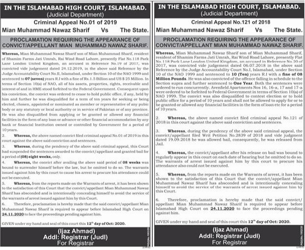 اشتہار میں تحریر ہے کہ ایون فیلڈ ریفرنس میں نواز شریف کو 10 سال قید اورجرمانے کی سزا سنائی گئی، ریفرنس میں 19 ستمبر 2018 کو نواز شریف کی سزا معطل ہوئی تو وہ جیل سے ضمانت پر رہا ہوئے، ریفرنس میں اپیل زیر سماعت ہے، سماعت کے دوران نواز شریف عدالت پیش ہونے کے پابند تھے، نواز شریف کی حاضری یقینی بنانے کے لیے وارنٹ گرفتاری جاری کیے گئے جس کی تعمیل نہ ہو سکی۔ اشتہار میں مطلع کیا گیا ہے کہ نواز شریف 24 نومبر کو عدالت میں پیش ہوں۔