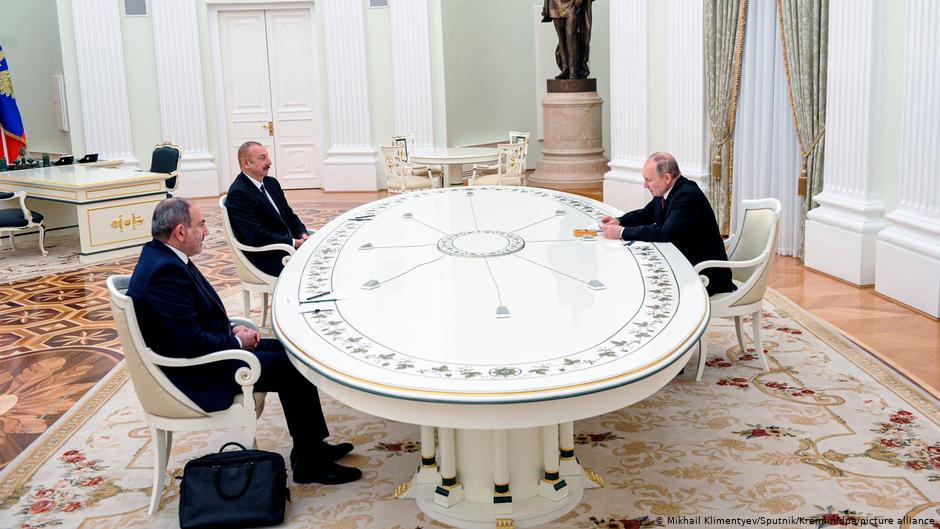 پوٹن، آرمینیائی وزیر اعظم نیکول پاشینیان اور آذربائیجانی صدر الہام علی ایوف نے گزشتہ نومبر میں ہونے والے معاہدے کے حوالے سے تبادلہ خیال کیا۔ پوٹن نے کہا کہ امن معاہدے نے ”پرانے تنازعے کے طویل مدتی اور مکمل حل کے لیے ایک ضروری بنیادی فراہم کردی ہے۔”
