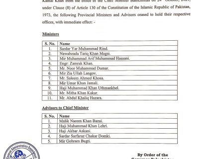کوئٹہ:صوبائی کابینہ کے تحلیل ہونے کانوٹیفکیشن جاری کردیا گیا 11وزراء اور 5مشیران کو کام کرنے سے روک دیا گیا۔گورنر بلوچستان کے حکم پر چیف سیکرٹری ..مزید پڑھیں